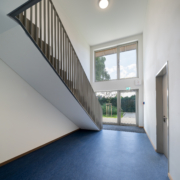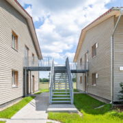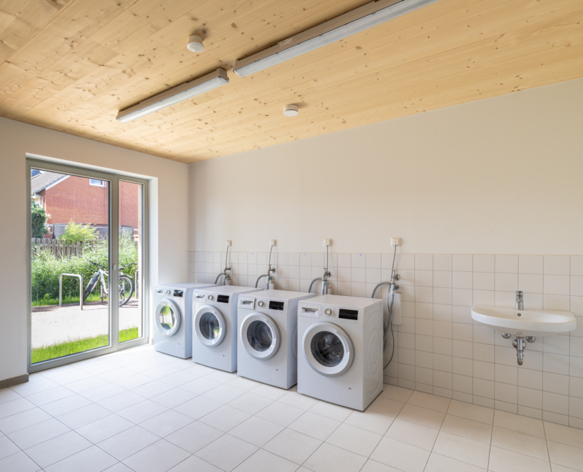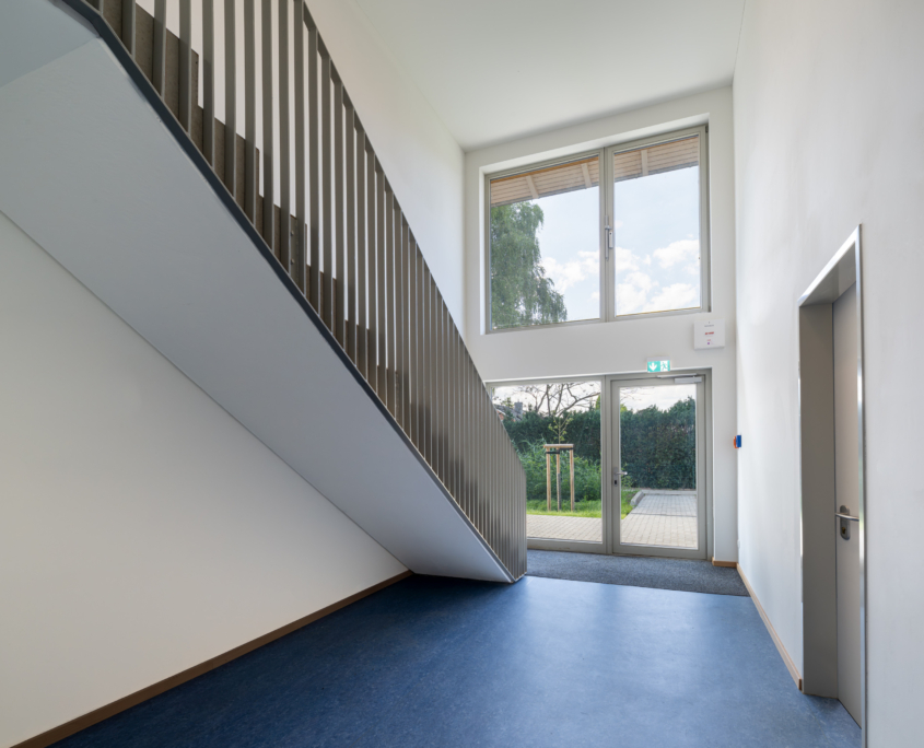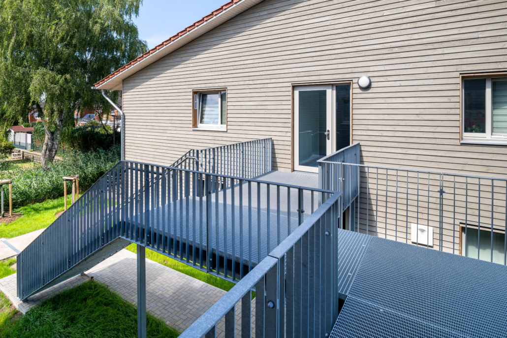 Alle Baukörper sind im Obergeschoss durch eine Gebäudebrücke mit zusätzlicher Podesttreppe verbunden. Durch den Verbund der beiden Gebäude wird die Gemeinschaft der Bewohner*innen gefördert und die Erschließungsflächen der Gebäude werden reduziert.